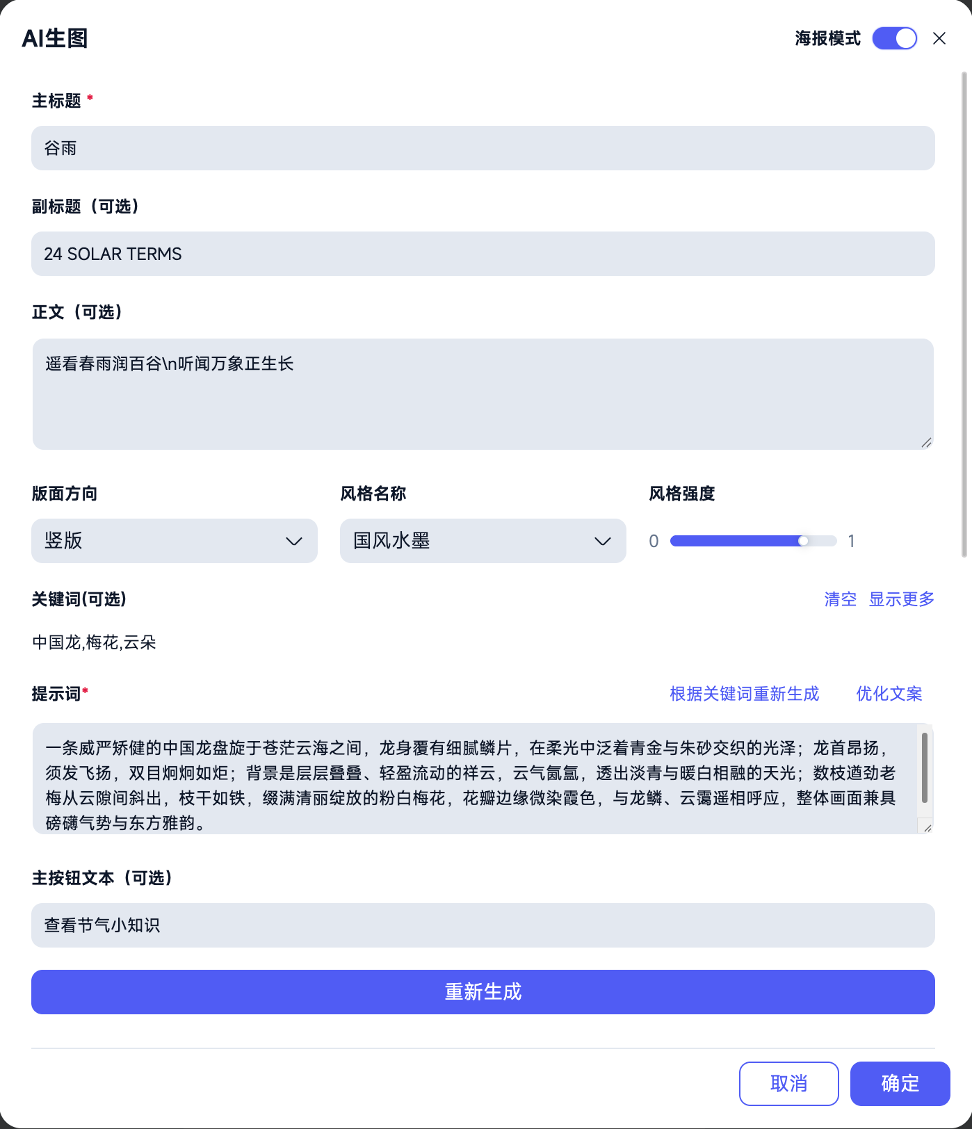 进入海报生成页面,按照要求填写入, 如下以“节气海报”为例: